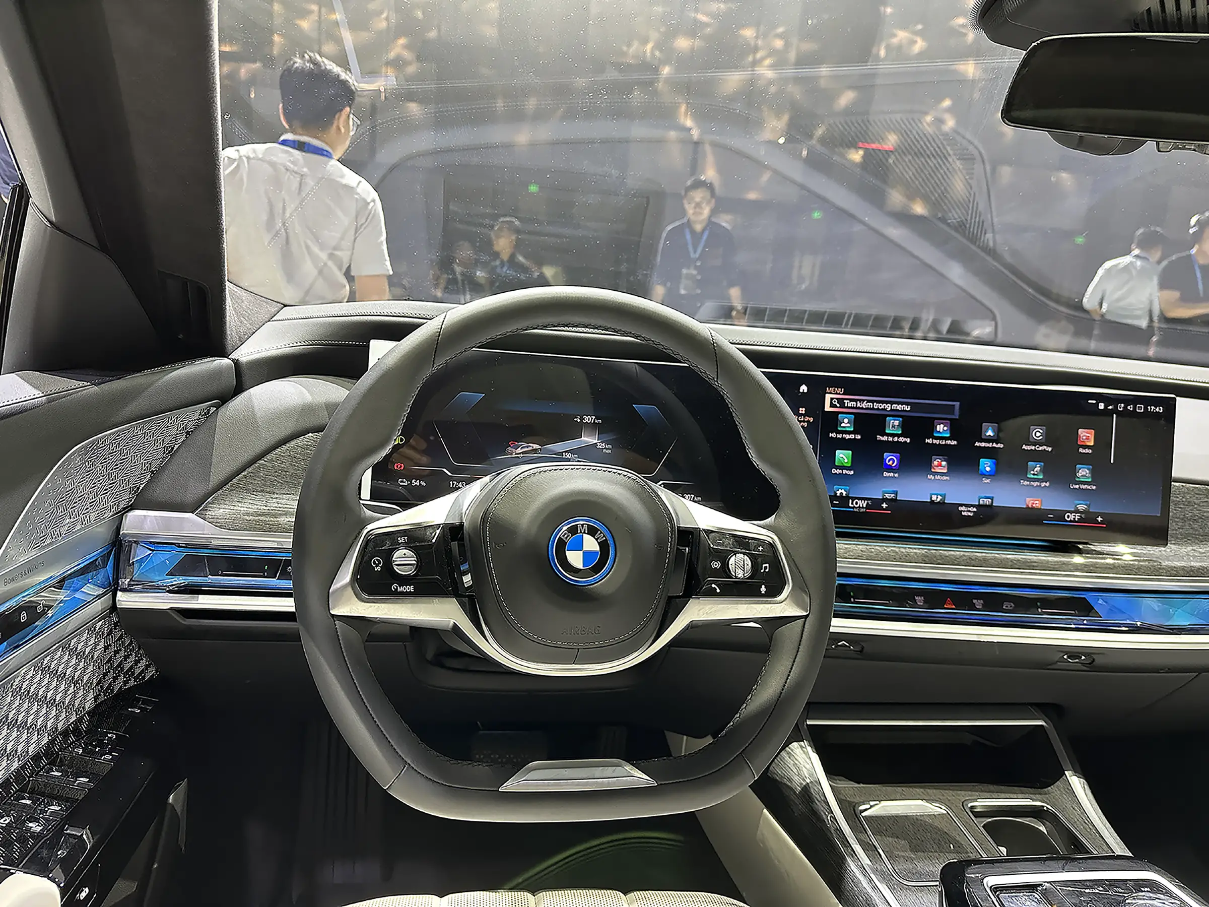Inside the i7, BMW has taken luxury to a new level. The interior is replete with high-end materials such as glass, crystal, wood, metal, and leather, beautifully presented across every surface. The steering wheel, exclusive to the electric variant, features a unique two-spoke design with a distinctive blue-bordered brand logo.