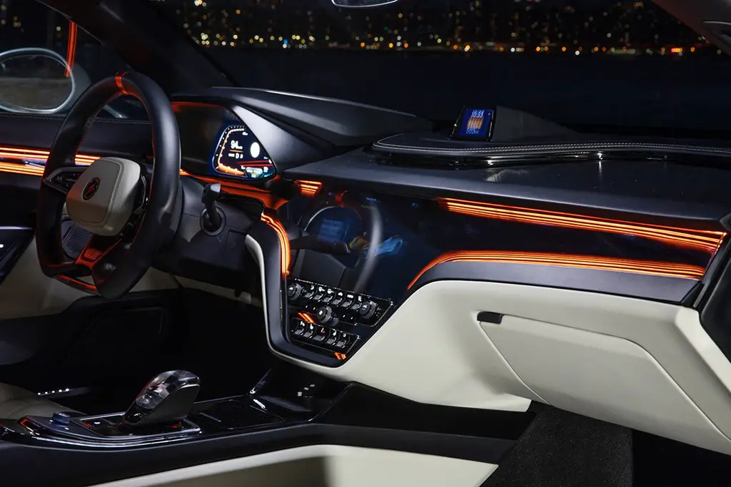 The interior of the supercar is adorned with environmentally friendly recycled leather materials, creating a beautiful and spacious environment. A large center console touchscreen and a stunning entertainment display add to the modern appeal of this remarkable electric vehicle.