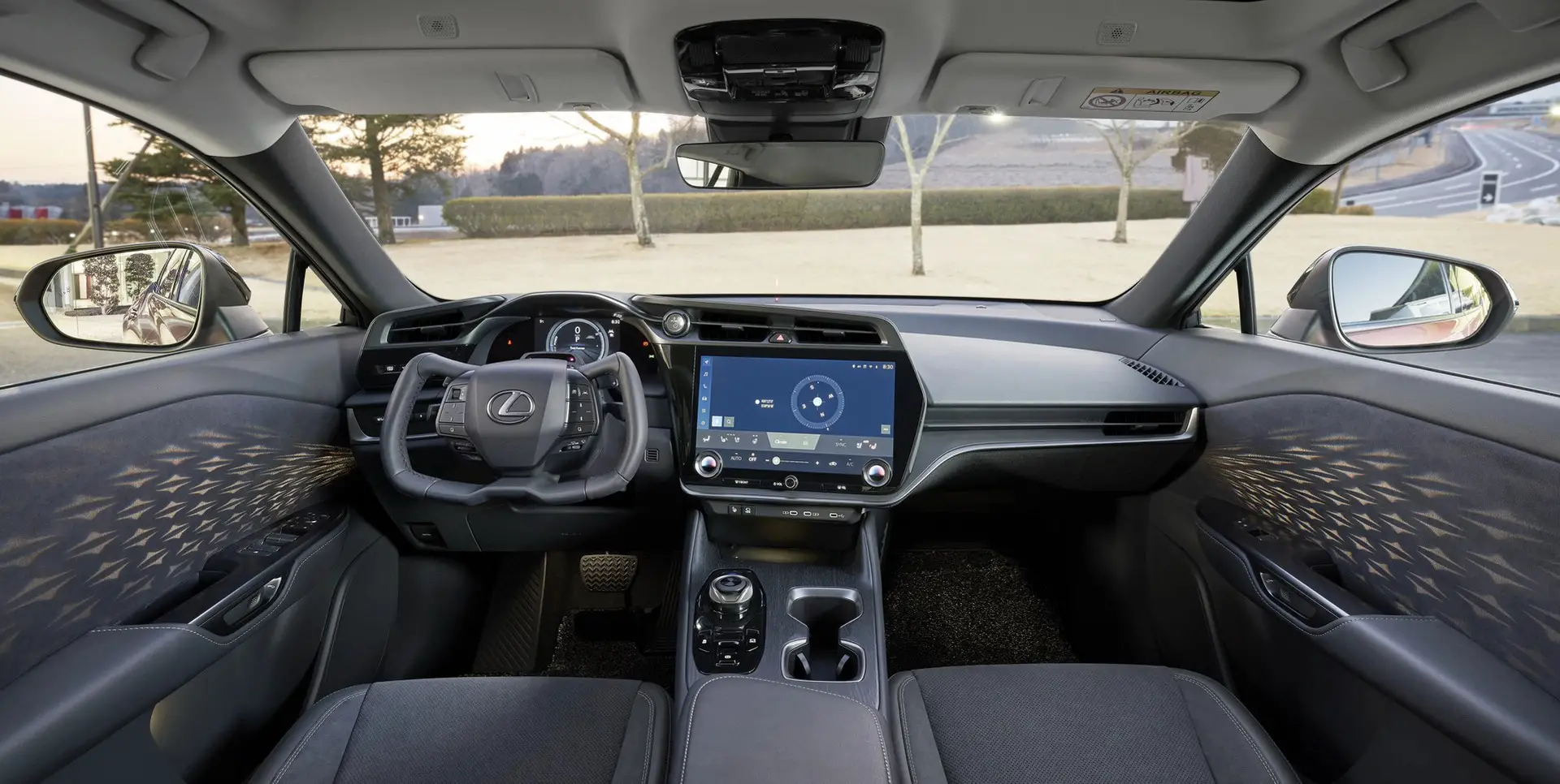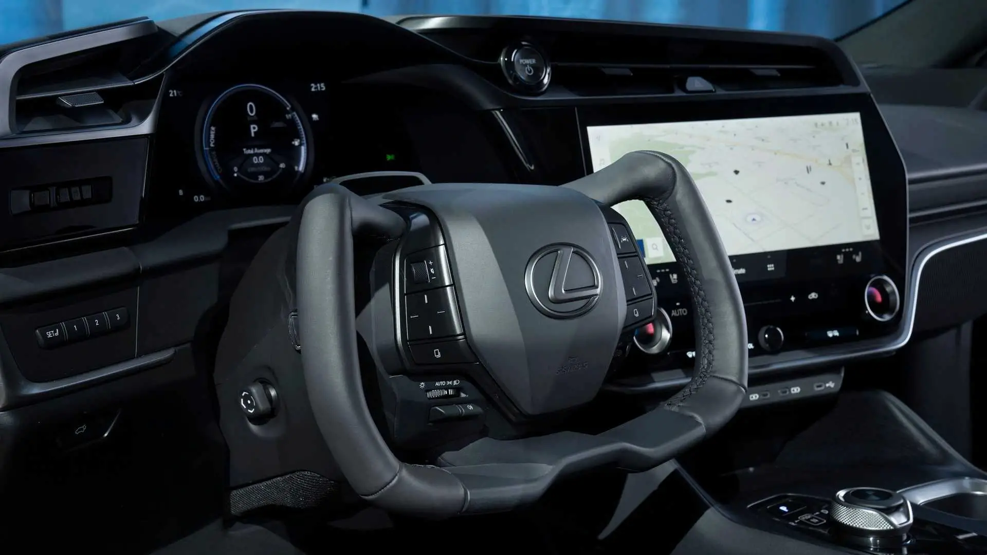 The interior of the RZ450e makes a bold statement with its multifaceted polygonal steering wheel. This steering wheel integrates a steer-by-wire electronic steering system, while a conventional steering wheel design is offered in the standard configuration. At the center of the dashboard is a large 14-inch touchscreen that houses virtually all control and customization functions. Its angled orientation towards the driver ensures excellent visibility and ease of control.