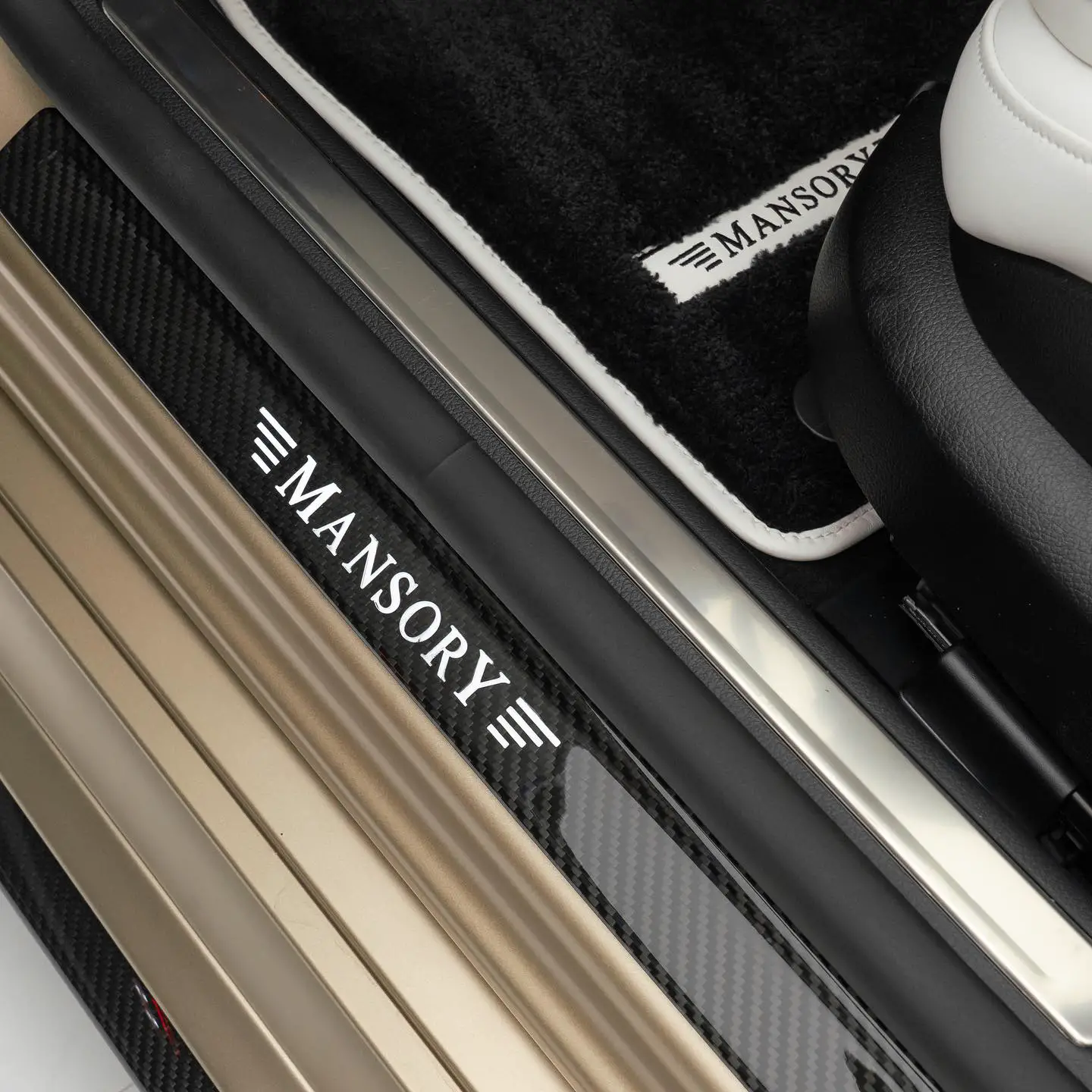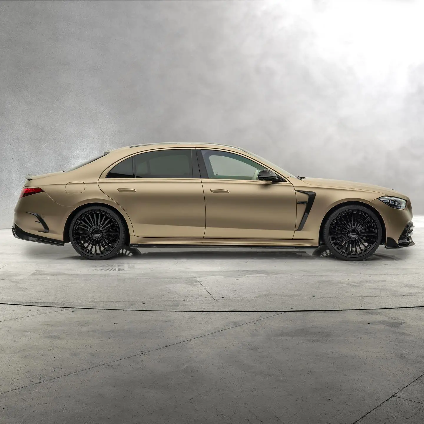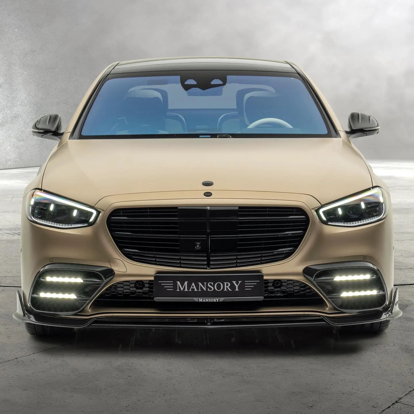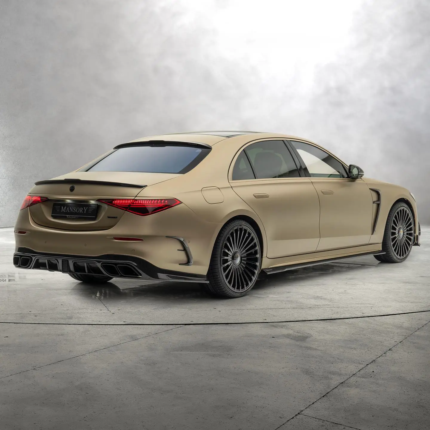 The standout feature of the MANSORY Mercedes-Benz S 580 lies in its captivating Kalahari Gold exterior finish, a signature touch by Mercedes-Benzâs Manufaktur division. The front fascia has undergone a sportier redesign, featuring a carbon fiber grille insert and a new aerodynamic air splitter. The rear is equally transformed, showcasing a carbon fiber wing and diffuser, along with bespoke Mansory insignia and new exhaust tips. Complementing the visual allure are the 21-inch Mansory wheels that perfectly harmonize with the carâs design language.